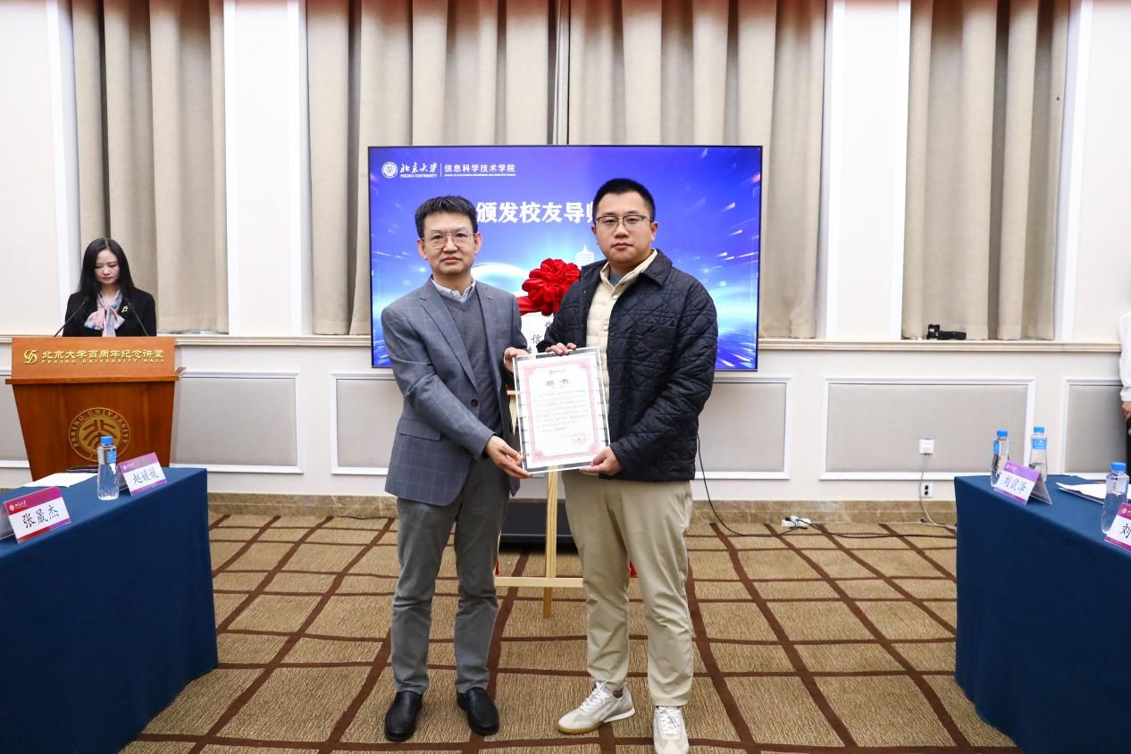 揭牌仪式后,侯士敏为解环宇校友颁发生涯发展校友导师聘书,聘请他为生涯工作室的首位校友导师。