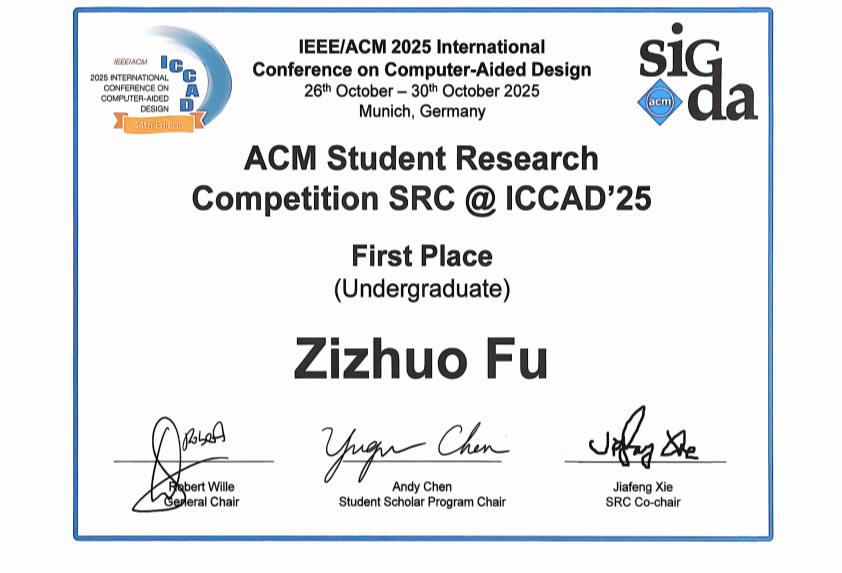 积极鼓励学生参加各类科技类竞赛,在国际舞台上充分展现了调教视频学生的科研实力与创新潜能。本届 SRC 竞赛由美国计算机学会(ACM)设计自动化专业委员会(SIGDA)主办,是国际集成电路与电子设计自动化领域最具影响力的学生科研竞赛之一。来自全球多所高校的31名优秀学生入围首轮评选,经过海报展示和现场答辩评审,傅子酌最终脱颖而出,摘得本科生组桂冠。