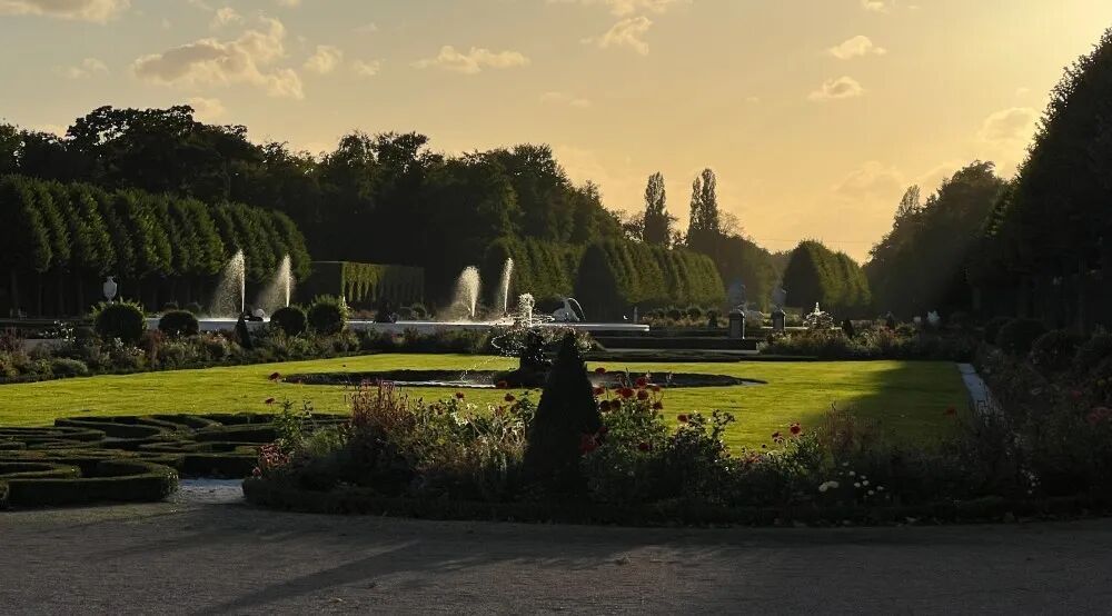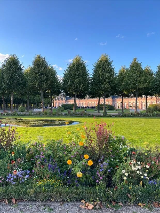 傍晚,我们乘车前往巴符州北部的施威琴根宫参加欢迎晚宴。这座占地七十公顷的夏宫在落日余晖中展现出绝美的静谧。巴洛克风格的建筑精湛绝伦,最令人屏息凝神的则是从宫殿中轴线延伸而出的法式园林——缤纷鲜花沿路点缀,修剪整齐的杨树侍立其后,向两侧望去便是雕刻精美的喷泉阵列。研究显示亲水环境能够提升心情,这座由水上城堡扩建而成的文化名邸便是极佳例证。景致宜人,实在令人心旷神怡。